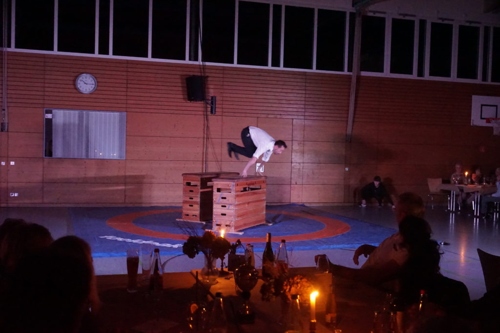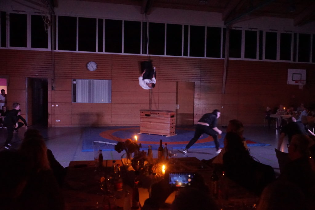Die süße Nachspeise, Apfelküchle mit Vanillesoße, wurde gefolgt von einem eindrucksvollen Auftritt der Akrobatik und Pole-Abteilung des SVE67, unter der Leitung von Sara Huh. Der Auftritt präsentierte gleich drei Bereiche der Abteilung in einem: Nach einer sportlichen Choreografie an der Pole von Sara und ihren Mädels folgte auf eine kurze Umbauphase der einzige Soloauftritt des Abends, bei welchem Lisa Huh kopfüber in einem Ring unter der Decke kunstvolle Figuren präsentierte. Den krönenden Abschluss machten anschließend Kamil und Sara mit einem weiteren Pärchen in einer anspruchsvollen, akrobatischen Nummer bestehend aus ausLuft- und Partnerakrobatik, welche die Zuschauer den Atem anhalten ließ.