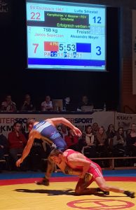 Janos Sepeczan bisher noch ungeschlagen, musste Gewicht abkochen, um in der Klasse 71 kg fr. antreten zu können. Hier war der bulgarische Spitzenringer und ehemalige Bundesligakämpfer Ivaylo Dimov für Waldkirch aufgestellt. Auch Dimov noch mit weißer Weste in dieser Runde. Das blieb auch so, denn Dimov siegte gegen den Eschbacher Gastringer mit 8:4 Punkten. Aber auch hier war das so schon kalkuliert, wichtig war nur, dass Janos keinen klaren Sieg zuließ, um weiter den Abstand so gering wie möglich zu halten.